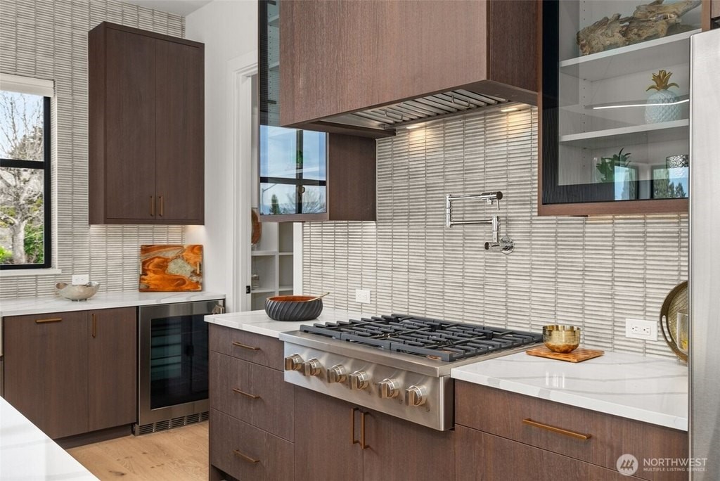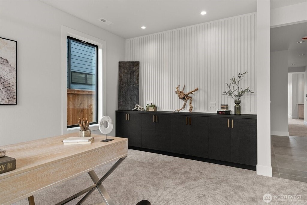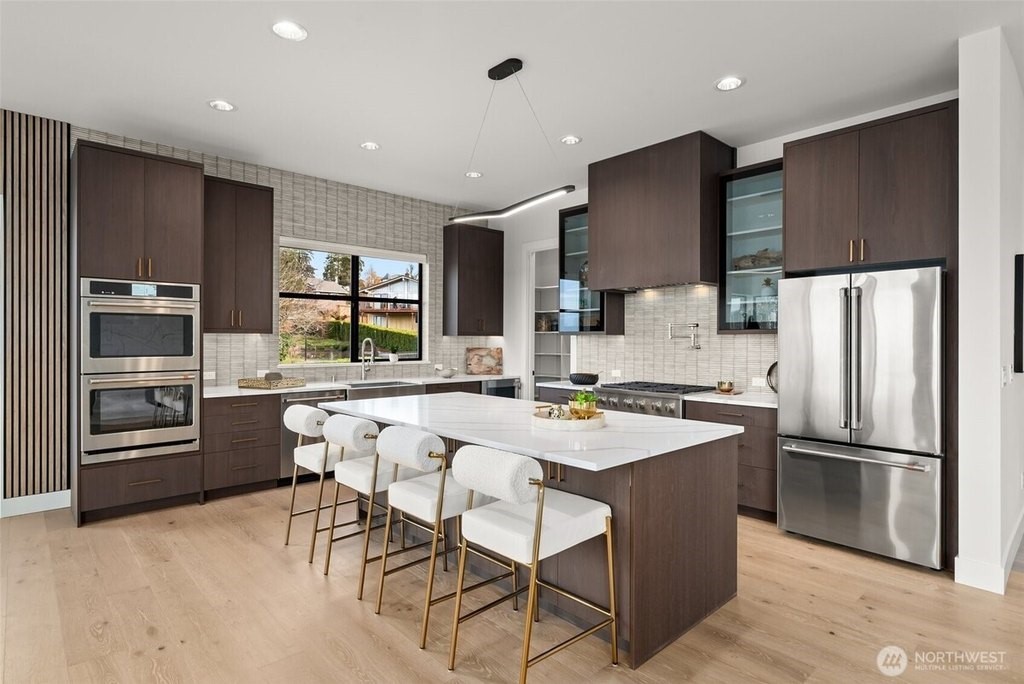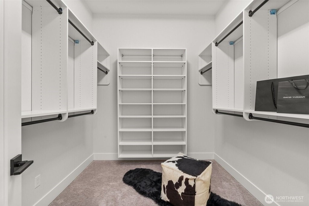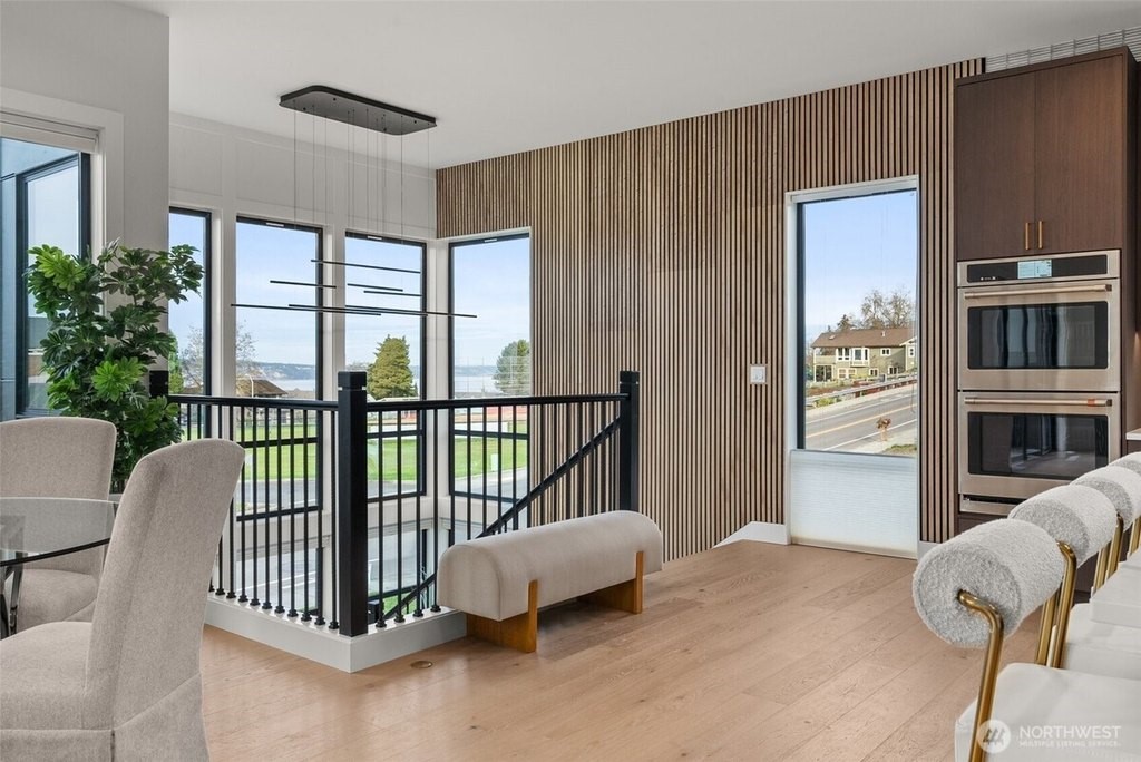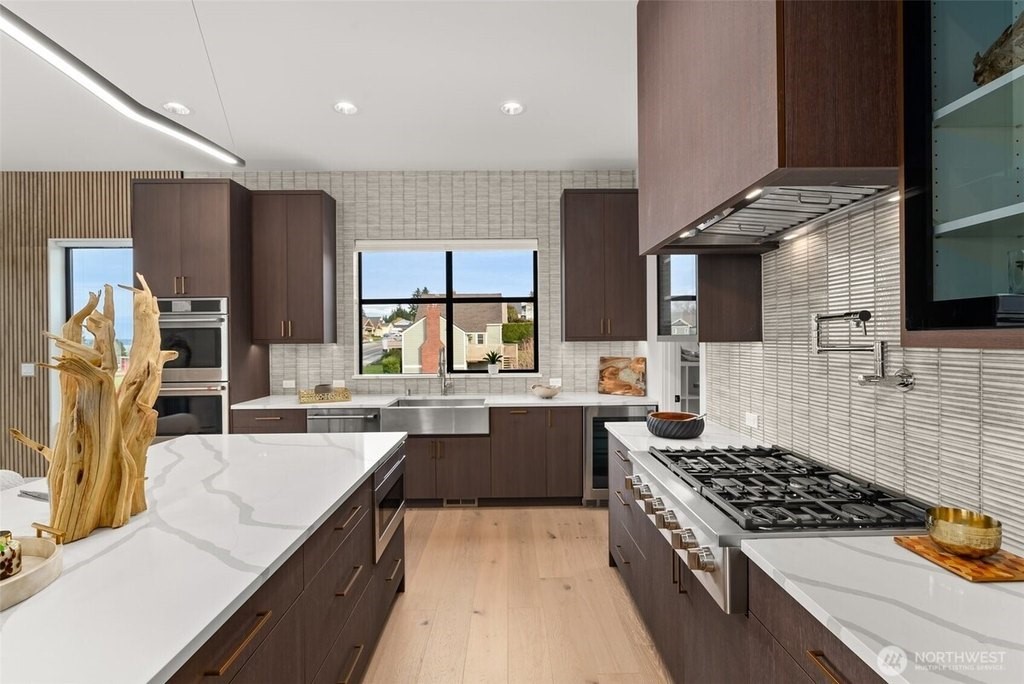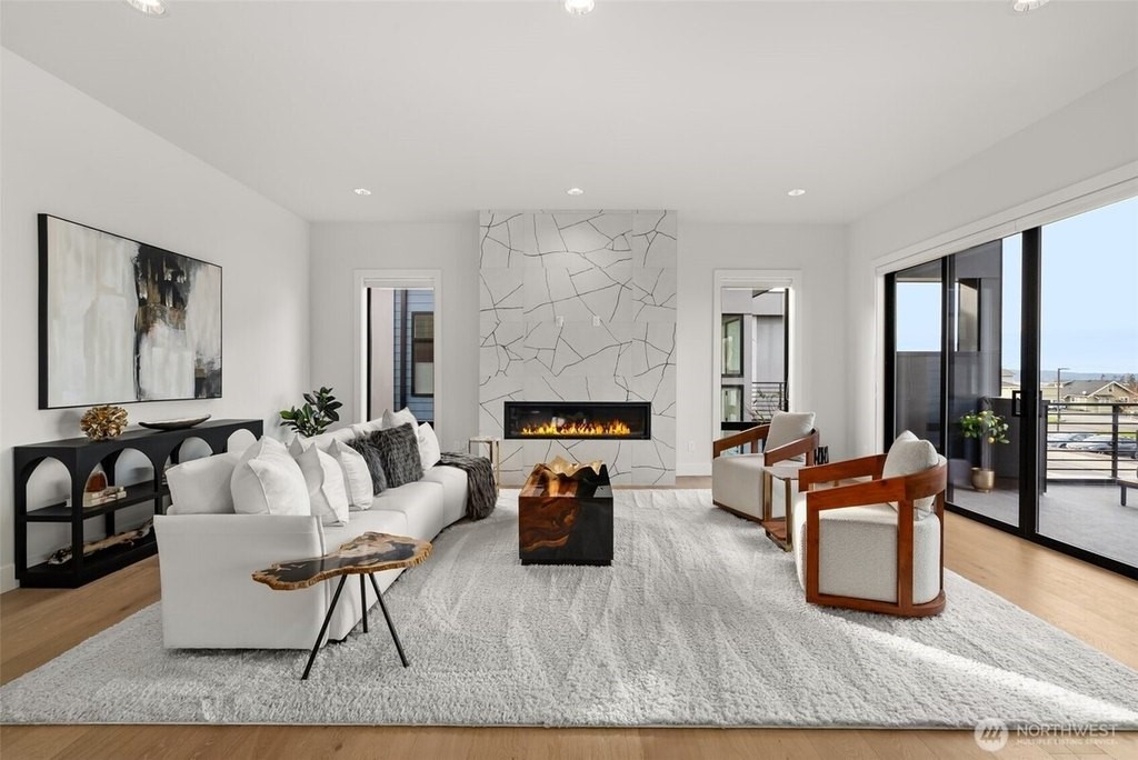Experience unforgettable sunsets and Puget Sound views from this exceptional home, perfectly positioned on a premium corner lot. A grand two-story entry welcomes you with striking accent walls and dramatic floor-to-ceiling black-framed windows that fill the home with natural light. The chef's kitchen is a true centerpiece, featuring custom cabinetry, quartz countertops, full-height backsplash, stainless steel appliances, double ovens, and a huge walk-in pantry. The open-concept layout flows seamlessly into the formal dining area and great room, highlighted by a floor-to-ceiling tile surround linear gas fireplace. Enjoy effortless indoor-outdoor living with a large wall slider opening to a covered outdoor space complete with its own linear gas fireplace-perfect for year-round entertaining. The main level primary suite offers a peaceful retreat with a generous walk-in closet and a luxurious five piece ensuite featuring a freestanding soaking tub and tiled walk-in shower. A private guest suite on the main level adds flexibility and convenience. The lower level expands your living space with a stunning second living room with fireplace, additional bedrooms, laundry, and a versatile flex space ideal for a home office, gym, or media room. Located just minutes from Chambers Bay, top-rated schools, and University Place shopping - enjoy all that this coastal living community has to offer!